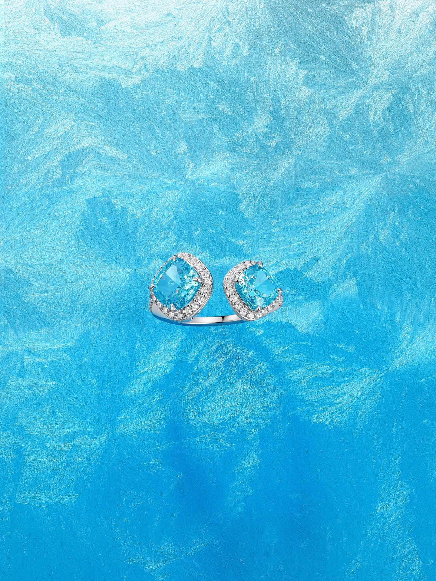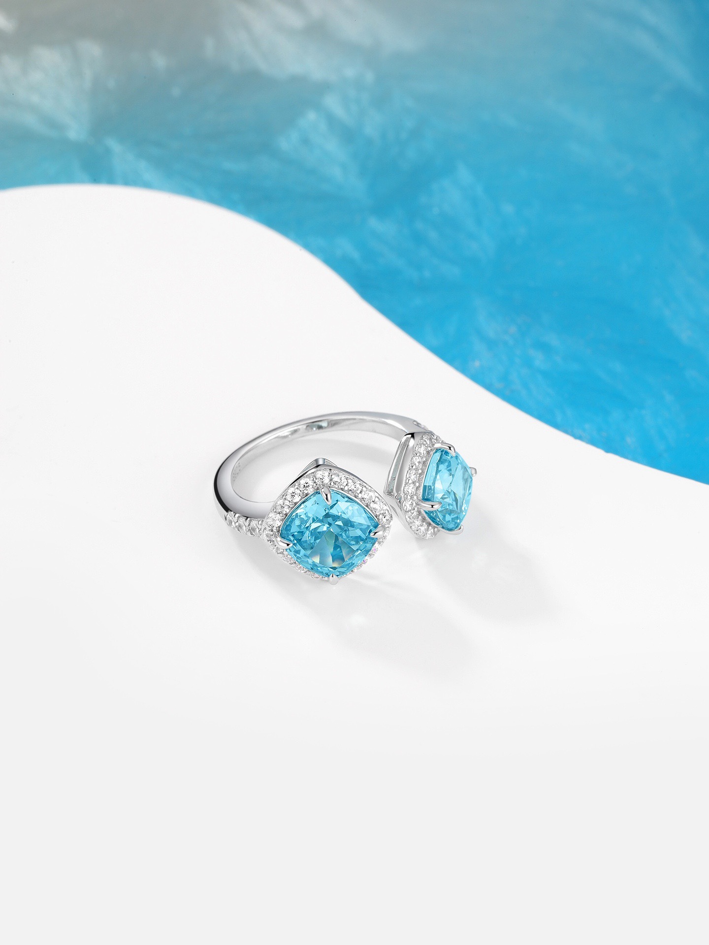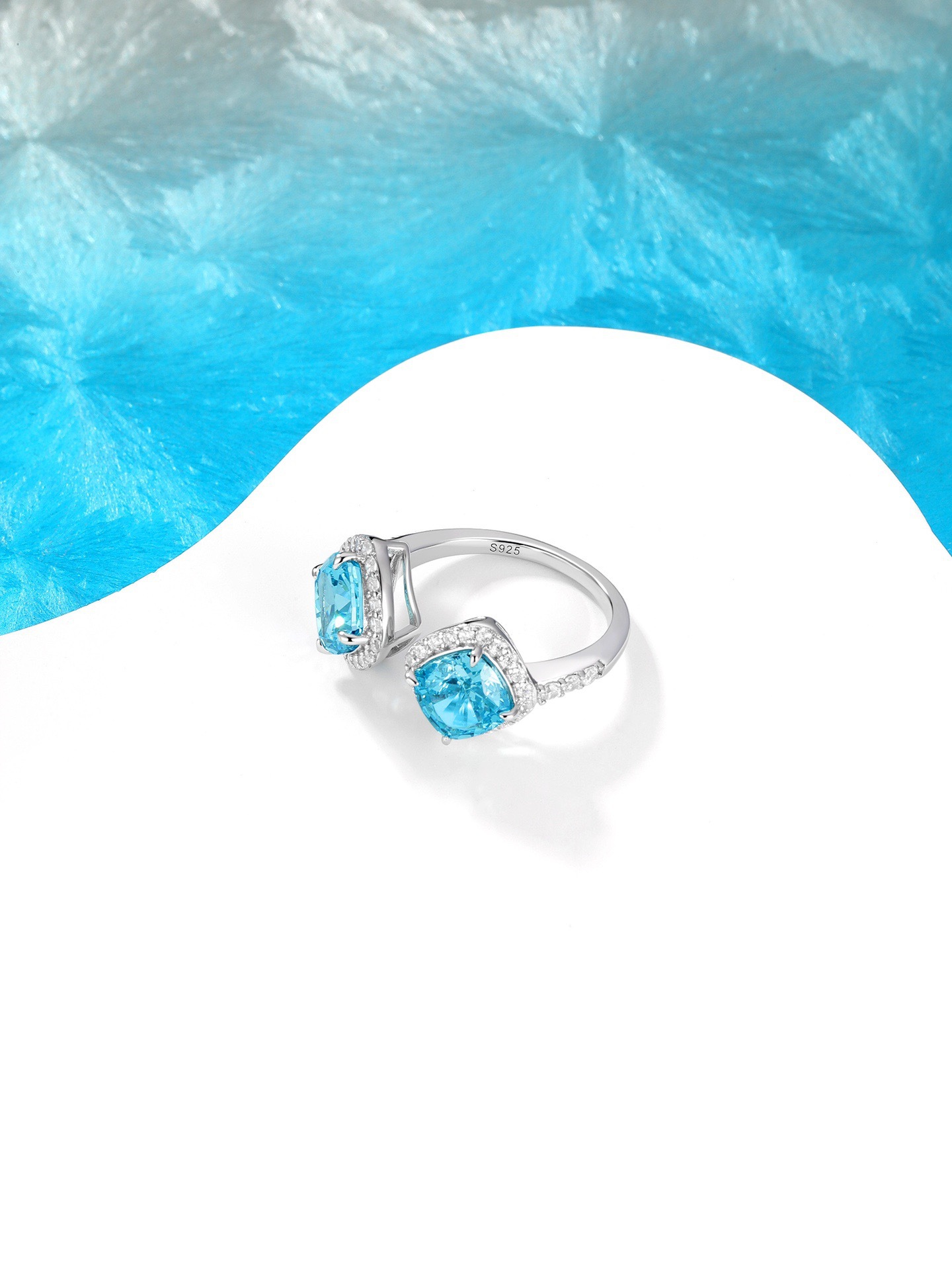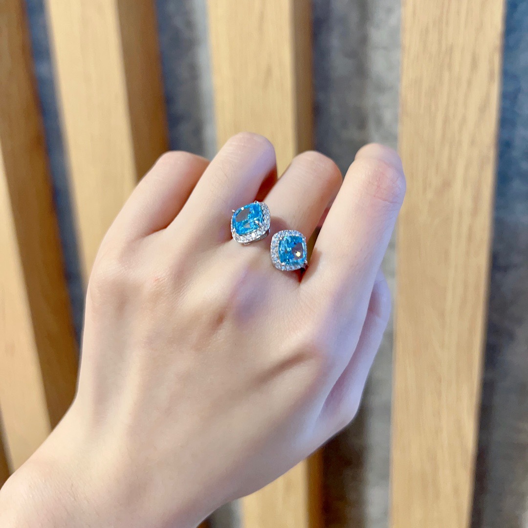 Halo Square Aquamarine Open Ring 925 Silver Cut Diamond Niche Design